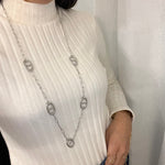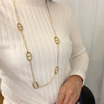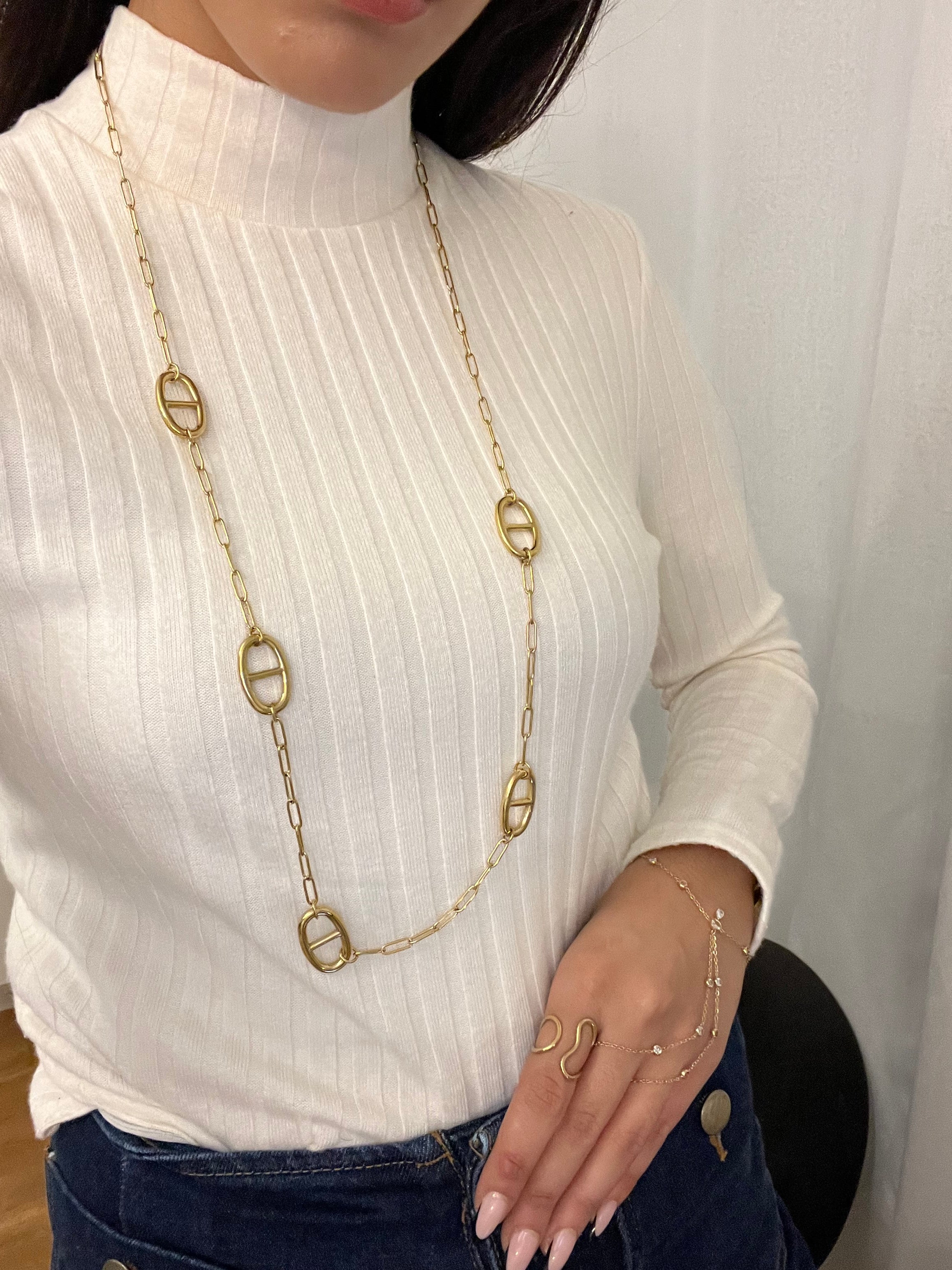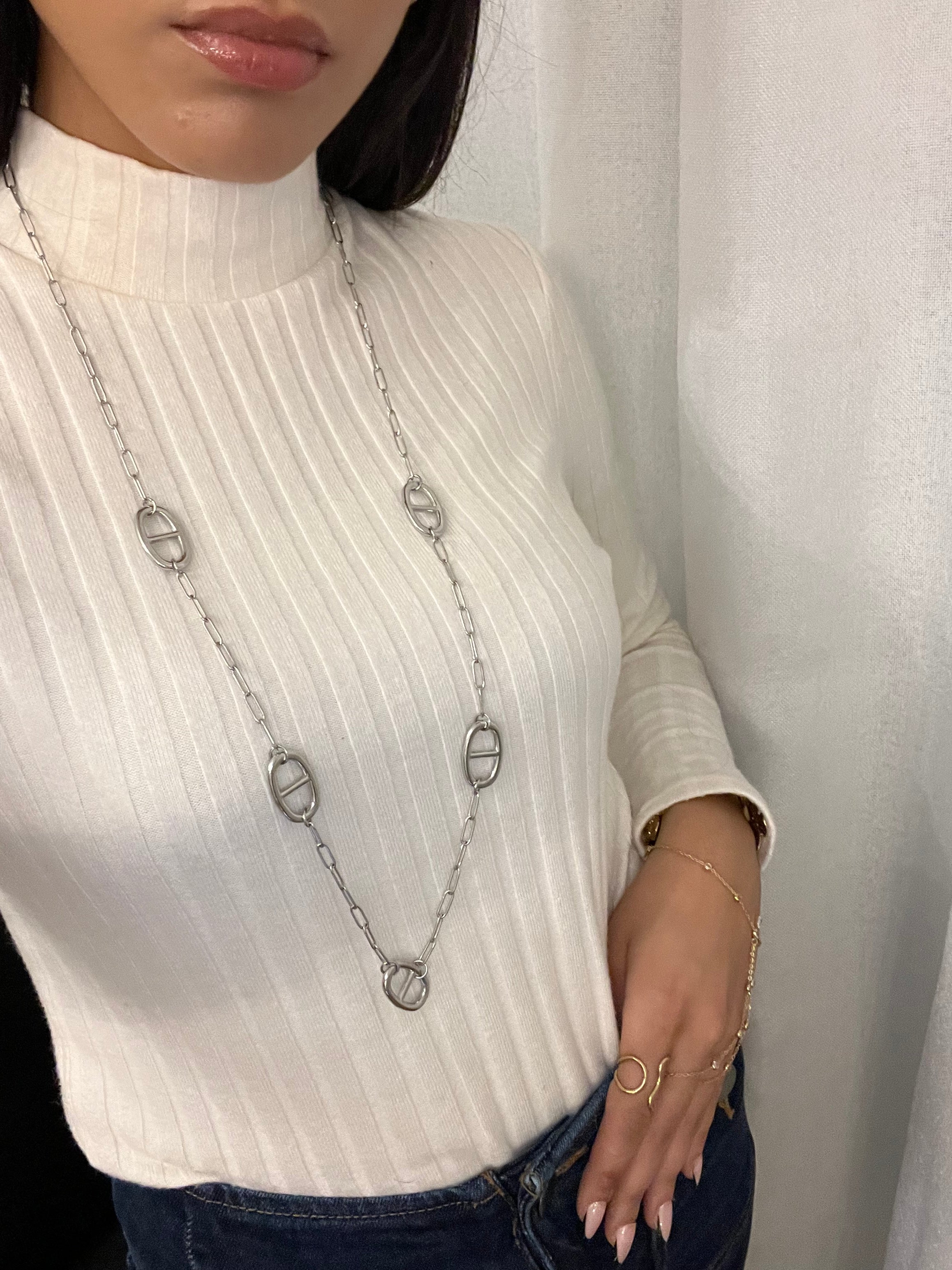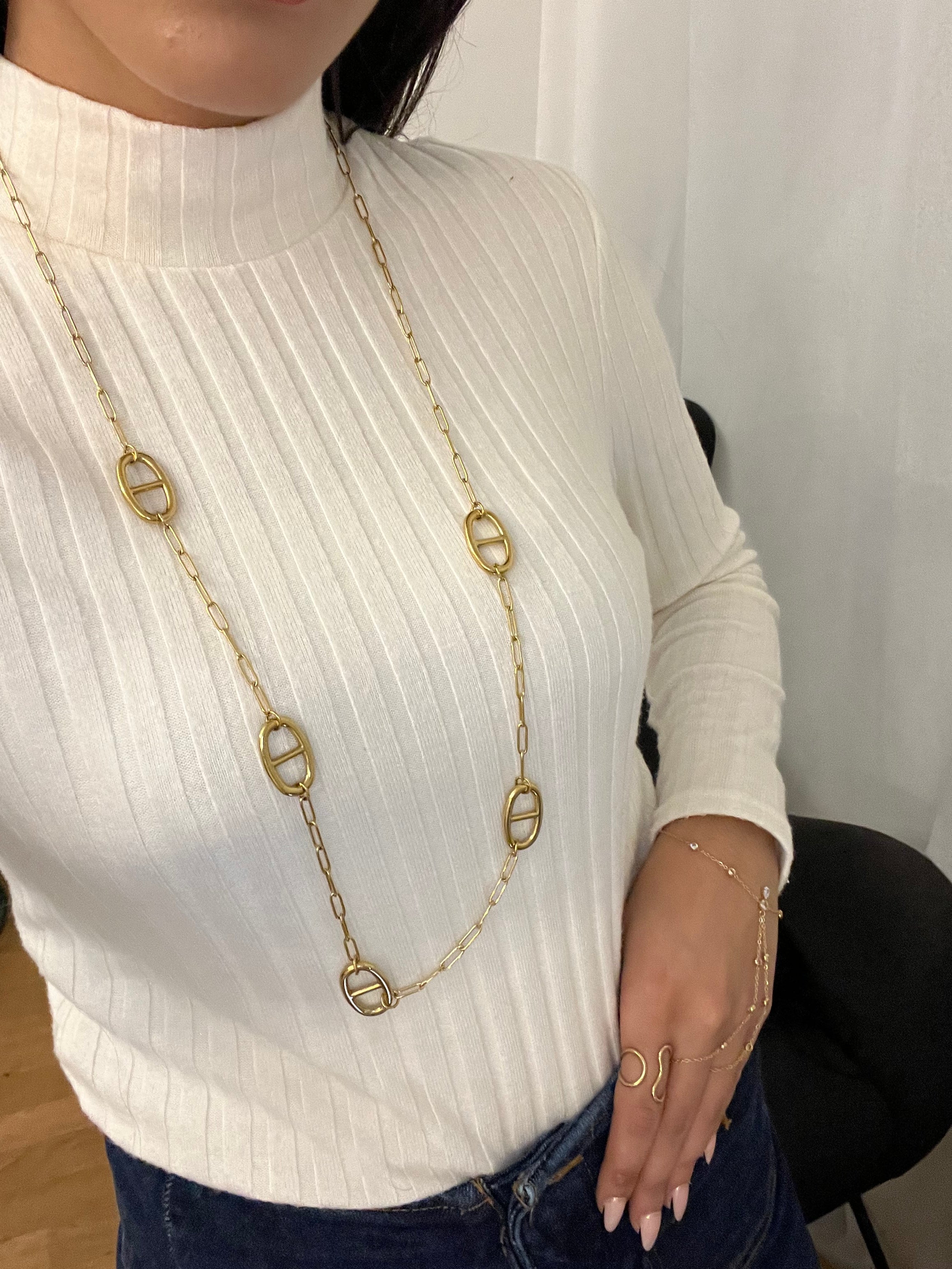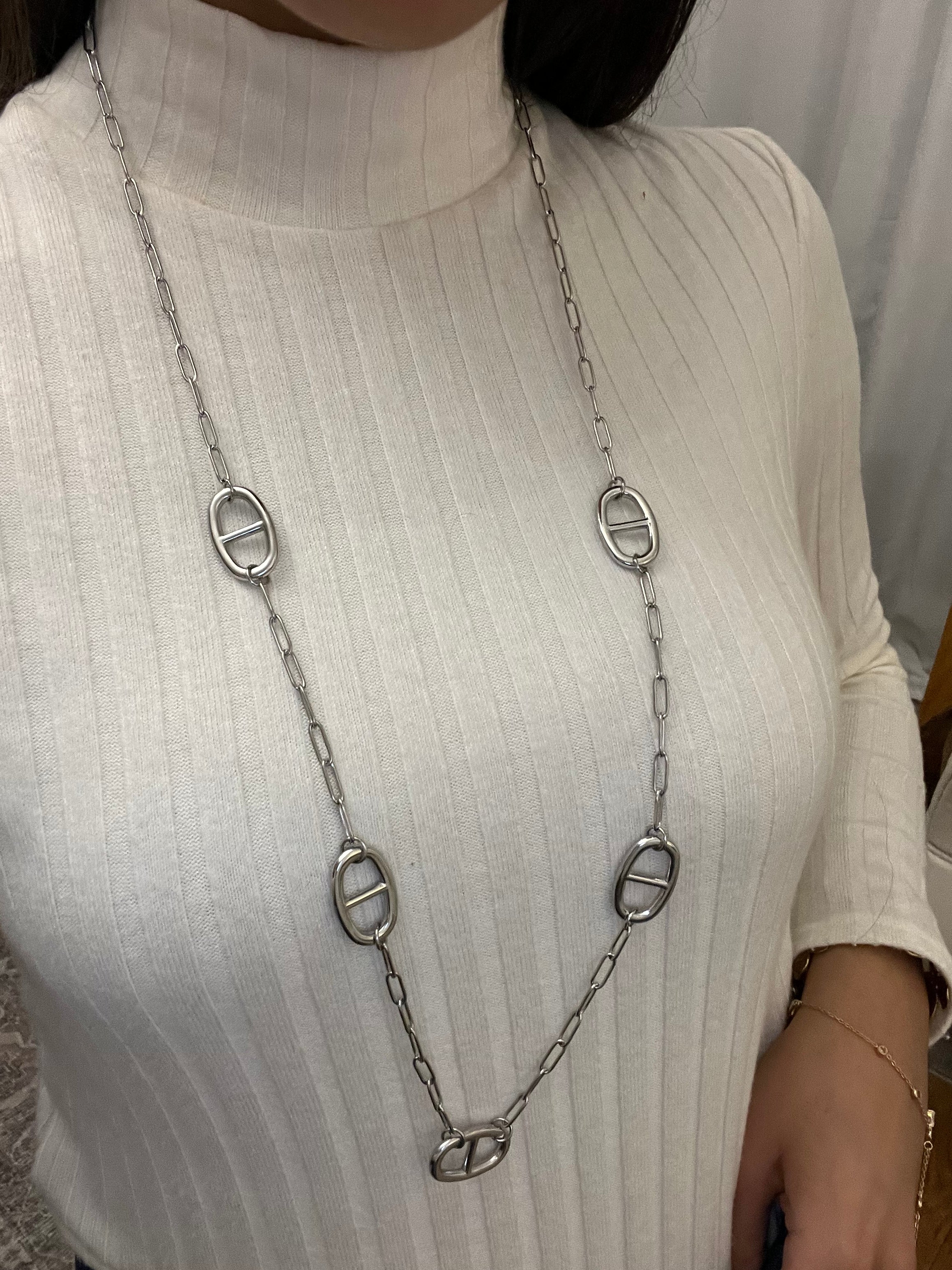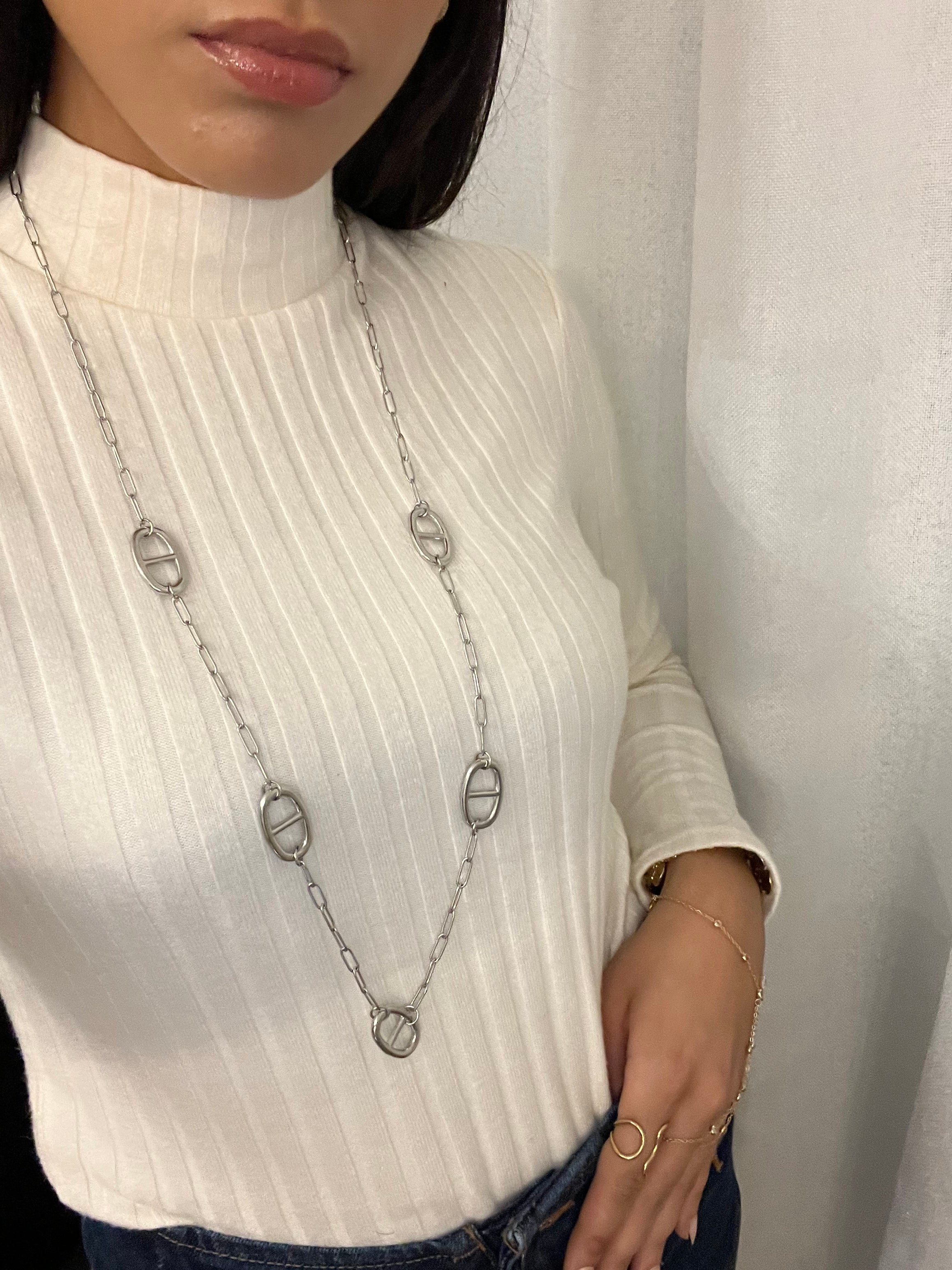 Un sautoir au design épuré, ponctué de maillons ovales emblématiques, qui allie simplicité et caractère.