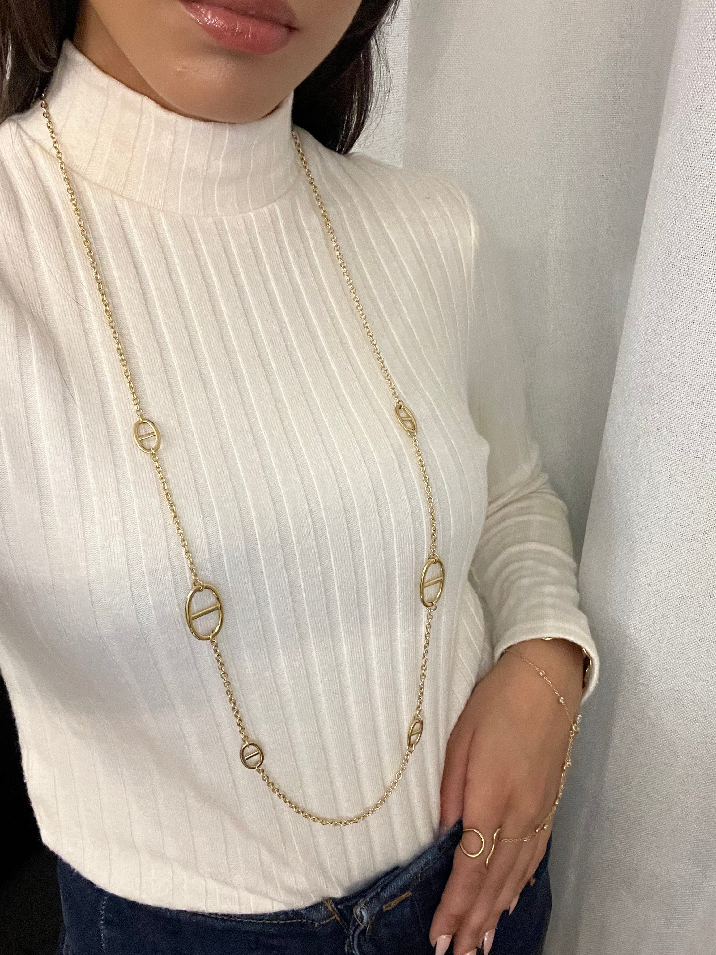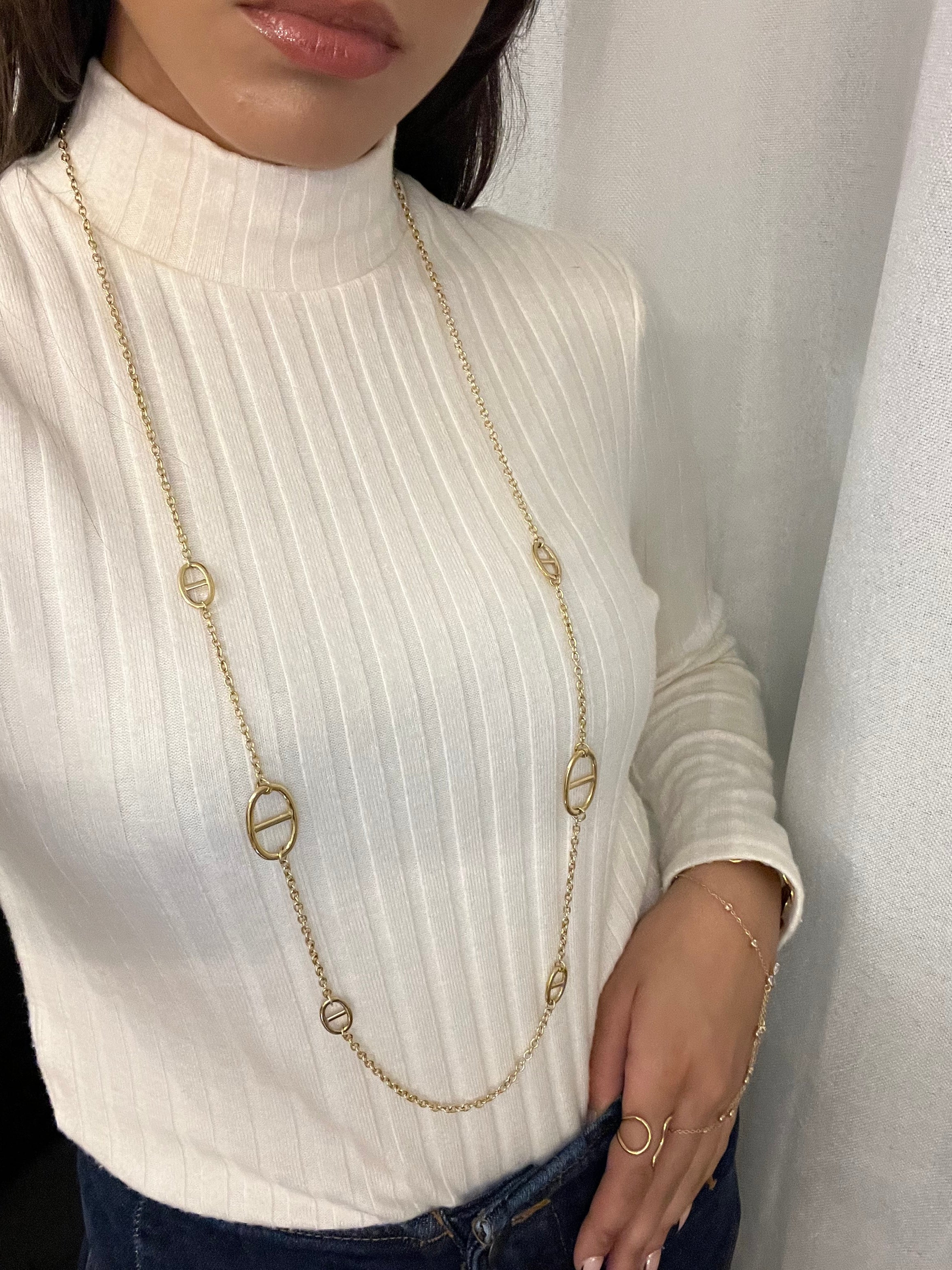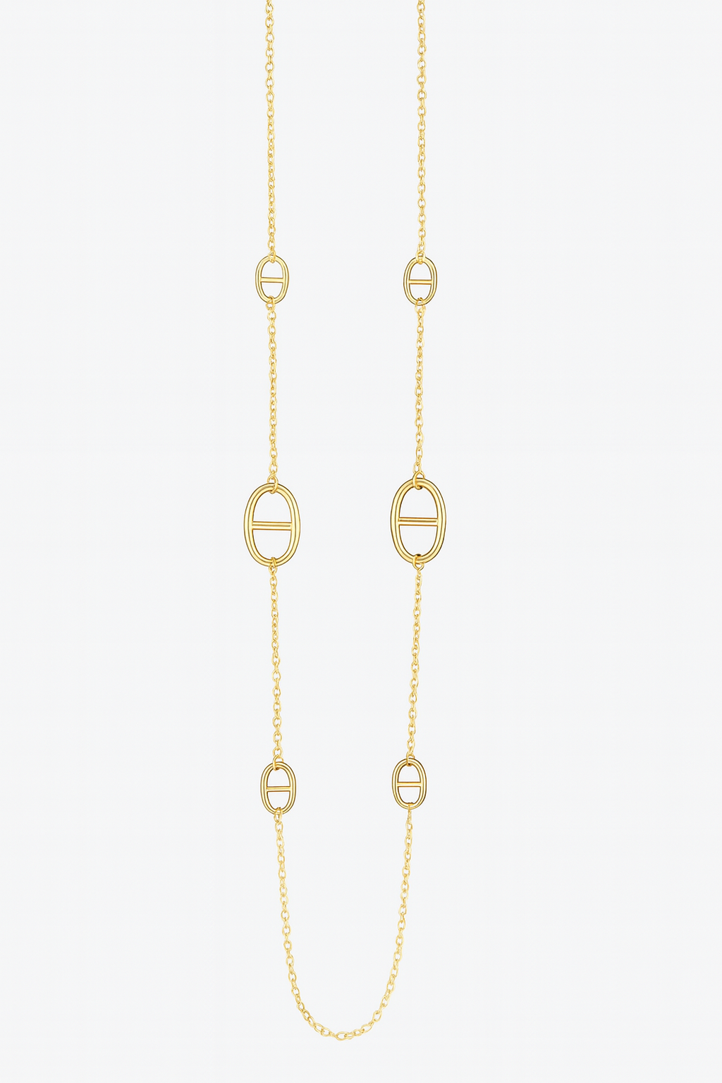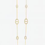 Un sautoir au design épuré, ponctué de maillons ovales emblématiques, qui allie simplicité et caractère.