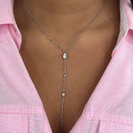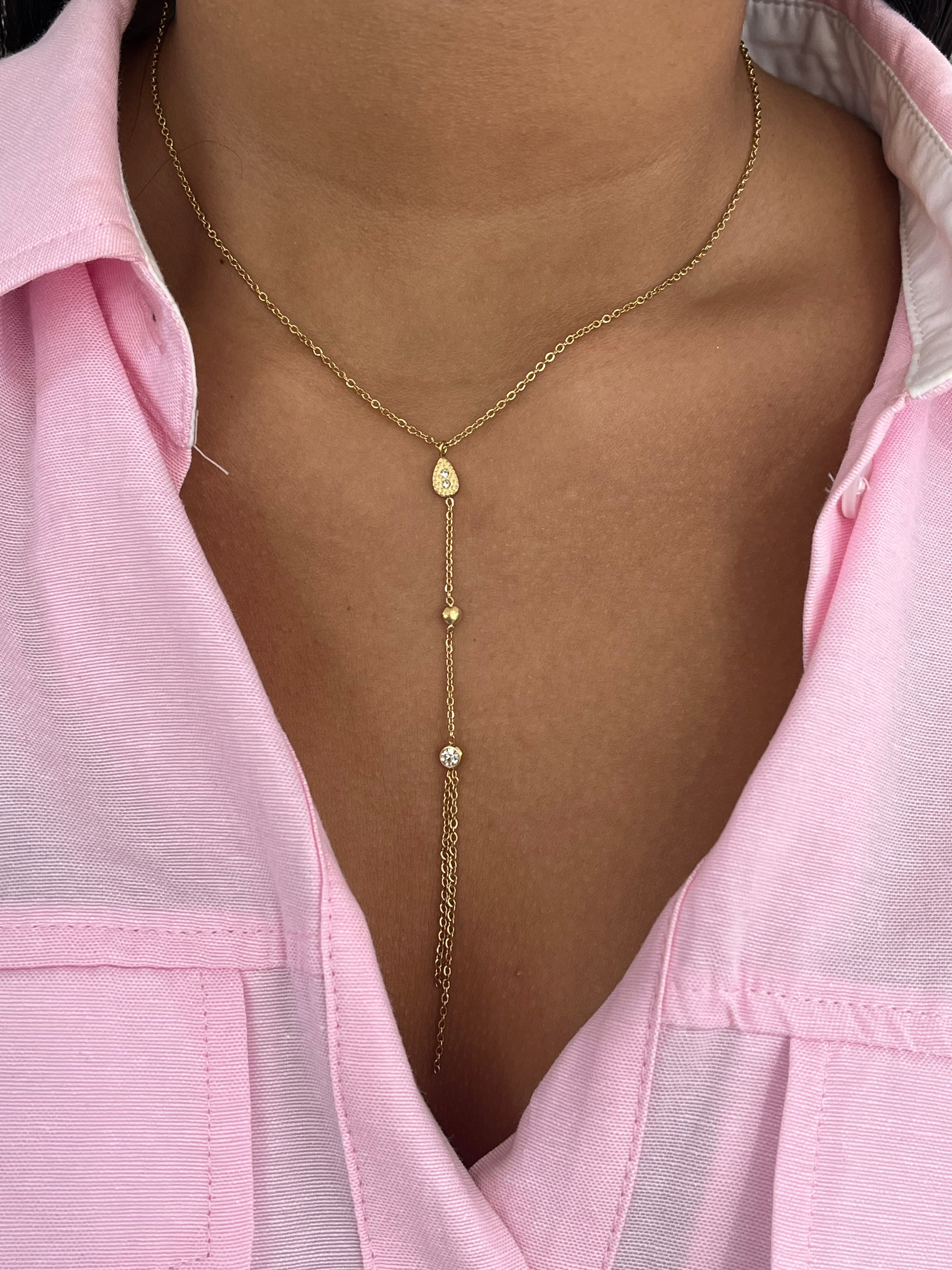 This Y-shaped necklace captivates with its slender silhouette and delicate details. Its central drop-shaped tassel, accented with small, shimmering pearls, catches the light and subtly enhances the neckline. An elegant and feminine piece, ideal for a polished look from morning to night.